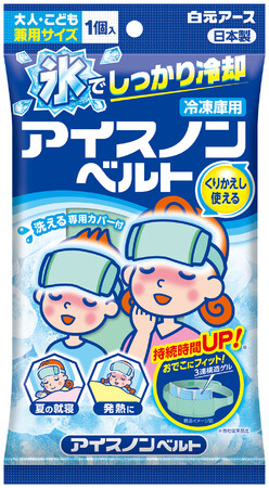 『アイスノンベルト』は、寝苦しい夏の就寝時や発熱時に使用する冷却グッズとして1970年に発売され、世代を超えて愛用されているロングセラー商品です。3連構造のゲルをやわらかい本体袋で包むことで、肌ざわりがよく、おでこにフィットします。シンメトリーな形状で上下左右の制限がなく、大人からお子様まで使用できる形状になっています。今回、冷凍庫で凍らせるとカチカチに固まる「凍結ゲル」を採用し、フィット感はそのままに持続時間を従来品の90分間から150分間に延ばすことができました。夏の就寝時や発熱時はもちろん、勉強中など頭をすっきりさせたい時にもご使用いただけます。