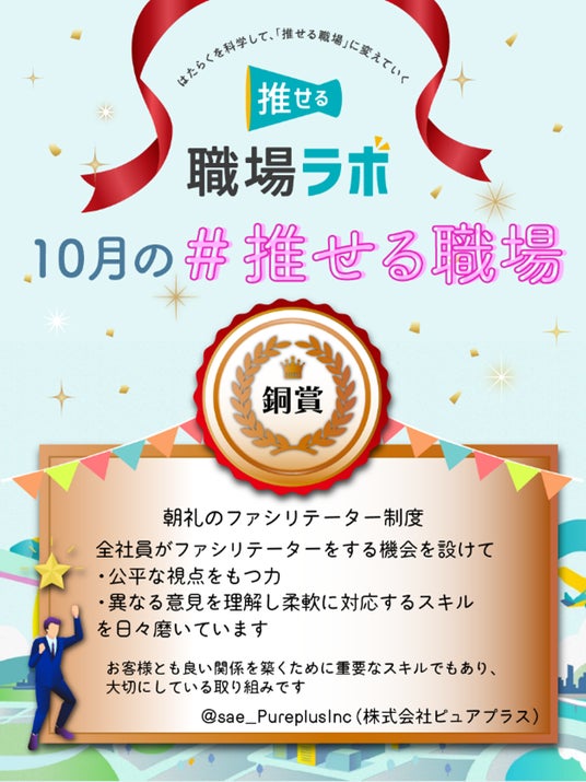 エンゲージメント向上を軸とした組織開発・人材育成コンサルティング支援を通して“推せる職場づくり”を進める株式会社NEWONE(本社:東京都千代田区 代表取締役:上林周平、https://new-one.co.jp/ 以下、NEWONE)は、「推せる職場ラボ」公式Xアカウントを通じて実施しているキャンペーンの10月度月間賞を決定しました。10月度の受賞者として、金賞には、株式会社バリューデザイン、銀賞にブロードマインド株式会社、銅賞に株式会社ピュアプラスを選出し表彰し、それぞれの取り組みを表彰しました。