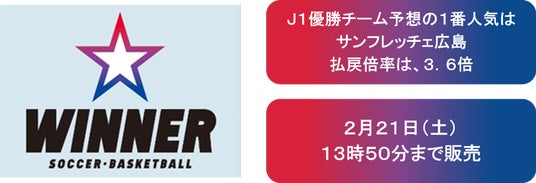 現在、明治安田J1百年構想リーグ(以下「J1リーグ」といいます)の優勝チームを予想する「競技会予想くじ」と、2月21日(土)・22日(日)に開催されるJ1リーグ及び明治安田J2・J3百年構想リーグ(以下「J2・J3リーグ」といいます)の第3節の各試合を対象とした「1試合予想くじ」を販売中です。