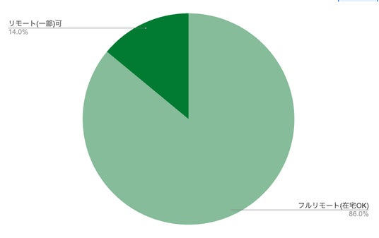 Figma関連案件のワークスタイルを見ると、フルリモートで働ける案件が86.0%と圧倒的多数を占めており、場所にとらわれない柔軟な働き方が主流となっています。残りの14.0%は一部リモートが可能な案件であり、完全出社を求める案件は皆無です。このデータからは、Figmaを活用する業務の特性上、物理的な制約が少なく、デジタルツールを活用したコラボレーションが一般的となっていることが読み取れます。