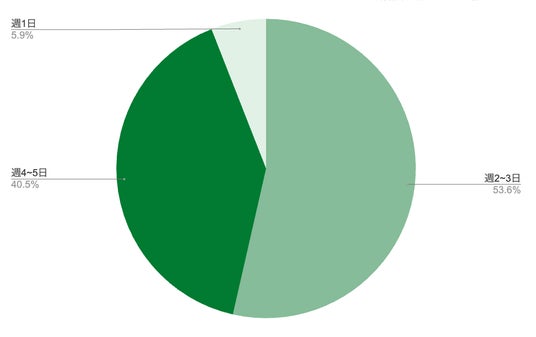 Figma関連案件における稼働日数の分布を分析すると、週2~3日の案件が53.9%と過半数を占めており、最も一般的な勤務形態となっています。次いで週4~5日のフルタイムに近い案件が40.5%を占め、週1日のスポット的な案件は5.9%と比較的少数です。この傾向から、Figmaのスキルを活かした働き方として、柔軟な勤務形態が主流となっており、副業やマルチプロジェクトの参画が可能な案件が多いことが分かります。