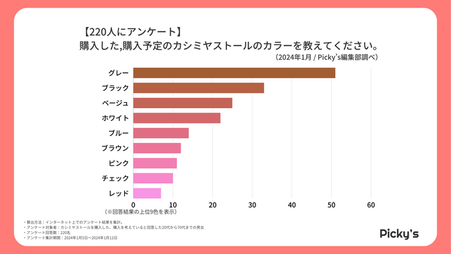 「Picky’s」は、インターネットショッピングにおいて、購入前に試せない・選ぶべきものがわからないという課題の解決を目標に、あらゆる商品のおすすめランキングや検証レビューを紹介するサイトです。このたびPicky’s(https://rentry.jp/)では、カシミヤストールについてインターネット上でアンケート調査を行いましたので発表いたします。