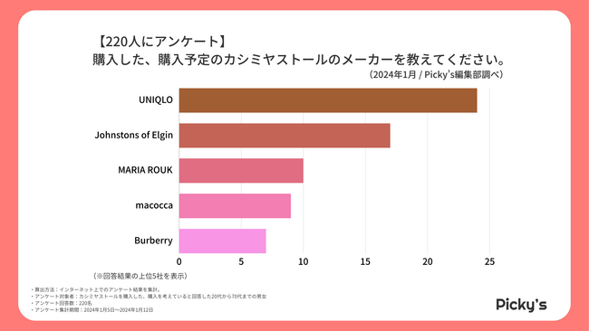 カシミヤストールの中で最も人気のメーカーは「UNIQLO」であり、手頃な価格帯と高品質なカシミヤ製品が支持されています。一方で、「Johnstons of Elgin」が2位になり、高級感やブランドの歴史に魅力を感じる人々にも支持されていることがうかがえます。こちらも質の高い製品が提供されていると考えられます。