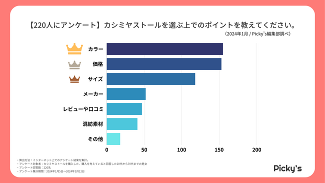 アンケートの結果、カシミヤストールを選ぶ際に最も重視するポイントは、「カラー」であり、次いで「価格」や「サイズ」が挙げられました。これは、アクセサリーとしてのファッションアイテムとしての役割を果たすストールにおいて、視覚的な印象やスタイリングに与える影響が大きいことがわかります。人々は自身のスタイルやコーディネートに合ったカラーを選ぶことで、個性を表現し、全体の印象を決定付けたいと考えているようです。
