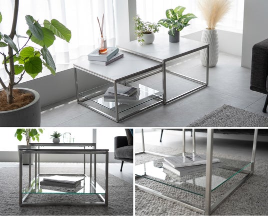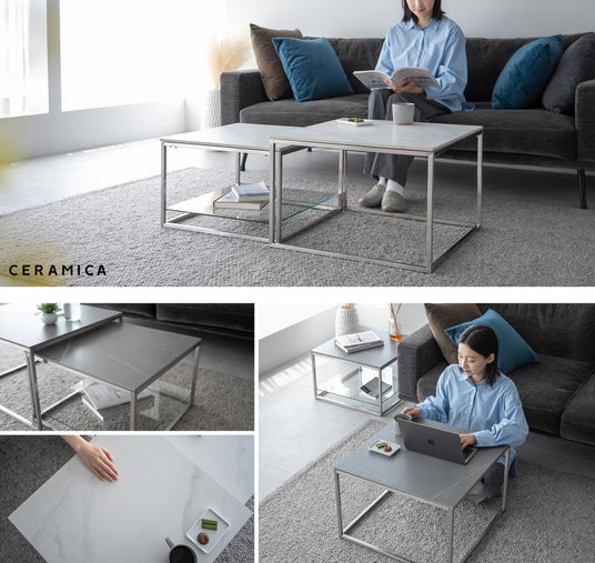 『セラミカ』は本物のセラミックとステンレスを使用した、コンパクトさと機能性を兼ね備えたネストテーブルです。大小2つのテーブルを自由に使い分けて、生活シーンに柔軟に対応します。