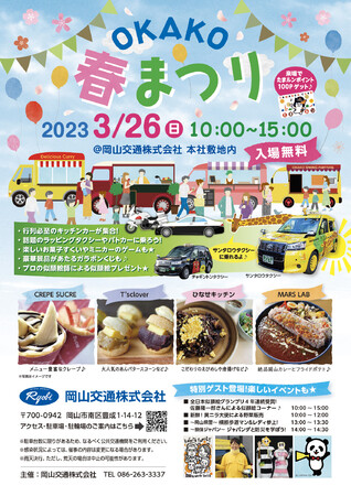 両備グループ(事務局:岡山県岡山市北区下石井二丁目10番12号 杜の街グレース オフィススクエア5階、グループ代表兼CEO:小嶋光信)のタクシー事業を運営する岡山交通株式会社(本社:岡山県岡山市南区豊成1-14-12、代表取締役:土江富雄)では、普段タクシーを利用する機会の少ない方々に、タクシーをもっと身近に感じていただくイベント「OKAKO春まつり2023」を下記の通り開催いたします。
