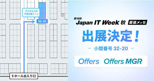 当社は「第5回 ソフトウェア&アプリ開発展 秋」における「デジタル人材不足対策ゾーン」に出展し、ブース内にてエンジニア、PM、デザイナーの副業・転職サービスと「Offers」、プロダクト開発組織の生産性を最大化するサービス「Offers MGR」の紹介をします。