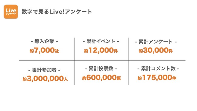 Live!アンケートがこの3年で導入企業数7,000社を超え、累計の参加者も300万人を超え、大変ありがたいと感じております。ひとえにご利用いただいているユーザーの皆様のおかげでございます。