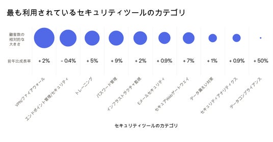 最も利用されているセキュリティツールはVPN/ファイアウォールであり、Oktaのお客様の過半数が導入しています。今回の成長率は前年比2%でした。日本においても、セキュリティツールの中でVPN/ファイアウォールの成長率が最も高く、前年比32%の成長率でした。