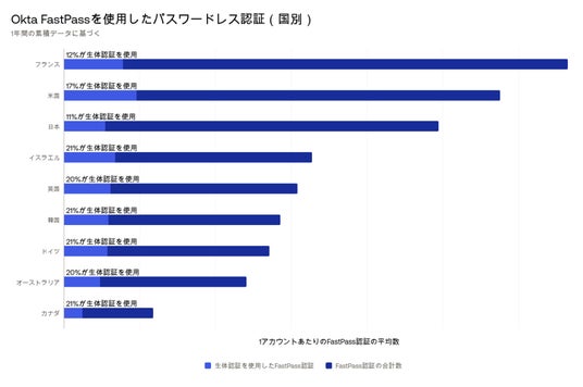 国別利用状況を分析すると、お客様1社あたりのOkta FastPassによる平均認証件数はフランスがトップでした。米国は2番目に高い平均認証件数でした。日本は、3番目に高い平均認証件数ですが、他の国と比較して生体認証の採用率が最も低くなっています。