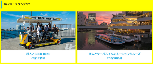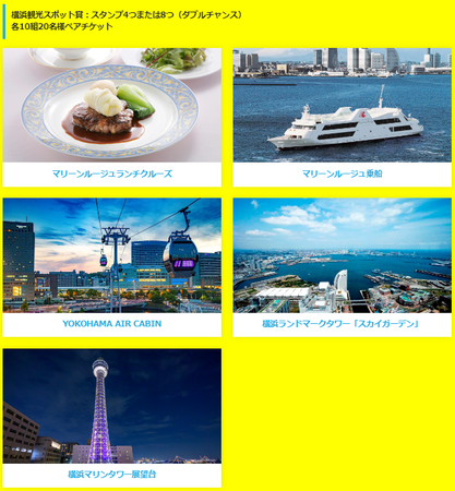 スタンプを4つ集めると【横浜観光スポット賞】が、スタンプを5つ集めると【瑛人賞】が、8つ集めると再度【横浜観光スポット賞】が抽選で当たる、トリプルチャンスがあります。