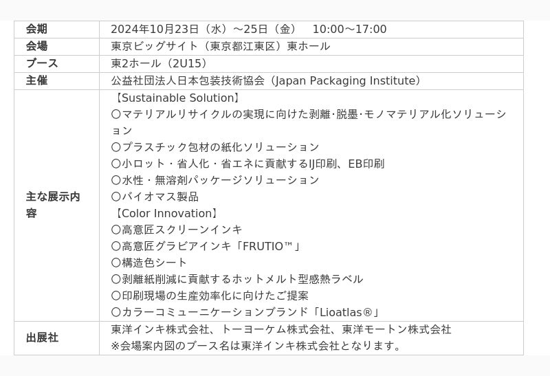 artienceグループ3社(東洋インキ株式会社、トーヨーケム株式会社、東洋モートン株式会社)は、2024年10月23日(水)~25日(金)に東京ビッグサイト(東京都江東区)で開催される「TOKYO PACK 2024(2024東京国際包装展)」に出展いたします。