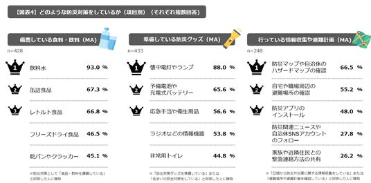 - 防災対策として「食品・飲料の備蓄」や「防災グッズの準備」が上位に