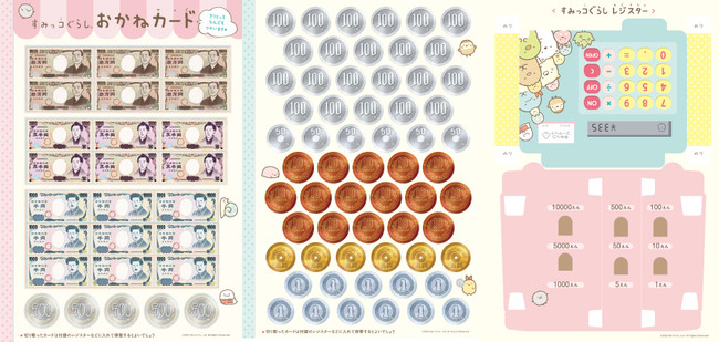 巻末に厚紙の「おかねカード」「すみっコぐらしレジスター」が3枚とじこみで付いています