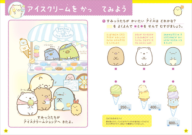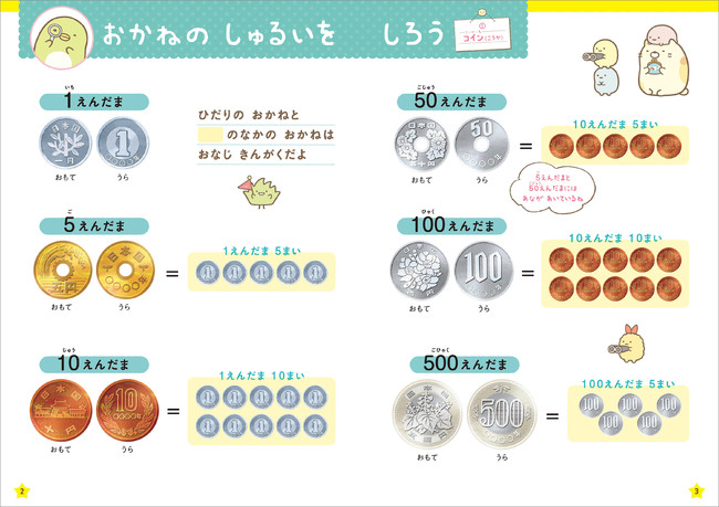対象読者年齢は5~7歳。お金の種類・数え方・大小などの基本を学ぶ問題からスタートして、すみっコたちとお買い物をしたり、お店へ行くような実践編へと進んでいく構成です。まるですみっコぐらしの世界に入り込み、すみっコたちと一緒にお金の使い方を勉強したり、お買い物をしているような気持ちで楽しく学べます。