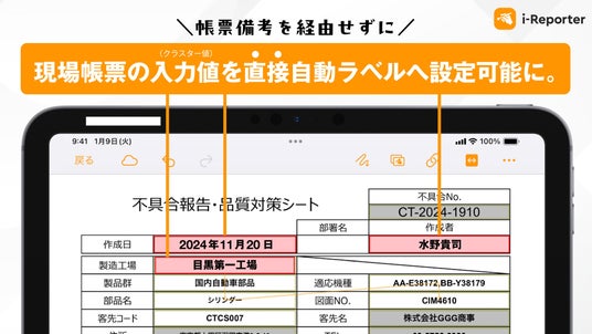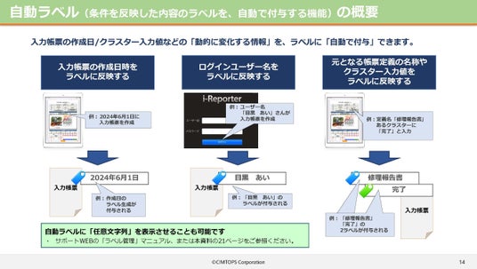 株式会社シムトップス(本社:東京都品川区、代表取締役:水野貴司)は、現場帳票デジタル化システム「i-Reporter」の新機能として帳票備考を経由せず、直接クラスター値を自動ラベルの命名規則に設定する機能を追加いたします。これにより、i-Reporter帳票内の入力値(クラスター値)を直接、自動ラベルに設定でき、より自由度の高い入力帳票の整理と保管が可能となります。