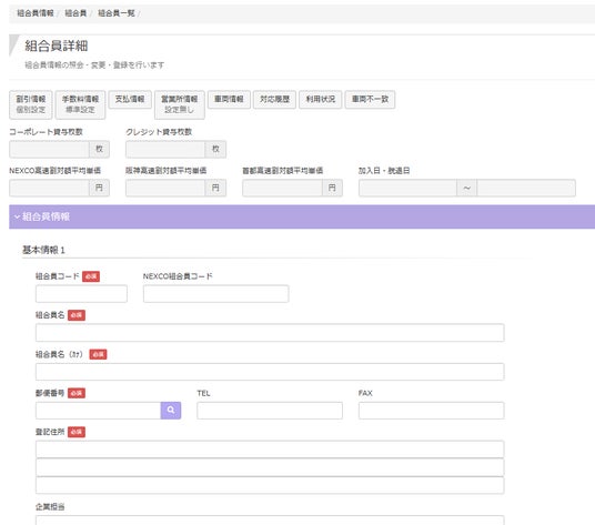 組合員に関わる情報(登記住所・TEL・FAX・担当者など)の管理はもちろんの事、車両・カード一覧や走行実績などを一元管理可能とし、エクスポート機能にてそれらの情報をダウンロードできます。