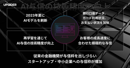 さらに、銀行口座データに加えて、UPSIDERカードの利用状況、お支払い状況などを加味して、お客様の成長速度に合わせた積極的な与信が可能となっており、従来の金融機関が与信枠を出しづらいスタートアップや中小企業への与信枠が増加しております。