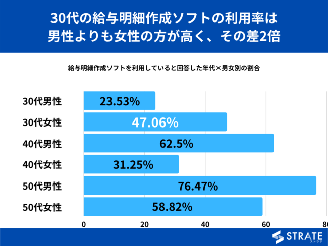 給与明細作成ソフトを利用していると回答した割合を年代×男女別でみてみますと、50代男性が最も多く76.47%、次いで40代男性の62.5%、30代は23.53%にとどまりました。