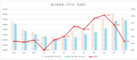 下表は、QTnetが作成した、2022年10月~2024年9月までにおける、電力使用量(1日あたりの平均値)を月ごとに比較したものです。SPACECOOLを導入した2023年9月15日から電力使用量削減の効果が現れ、特に日射量が多く、7月に最大10.3%の削減率を確認できるなど、気温が高まる4月~8月にかけて大きな効果を得られたことを確認できました。