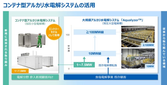 そのような状況下で、水電解分野に新規参入する企業の増加が見込まれる中、今回両社が開発を進めるシステムは、当社が開発を進めてきた大規模アルカリ水電解システム「Aqualyzer」と比較して小型であり、主に導入コストや設置スペース、納期などの面で負担が少なく、新規参入企業を中心に需要が拡大することが見込まれます。同時に、水電解装置の導入にあたっては、長期運用を見据えた顧客サポートの体制構築や、実績と信頼の確立が必要とされています。