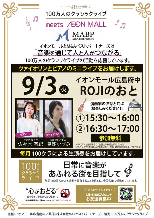 製造、建設、不動産、医療・ヘルスケア、物流、ITに特化したM&A仲介を行う株式会社M&Aベストパートナーズ(本社:東京都千代田区、代表取締役社長:齋藤 達雄 以下M&Aベストパートナーズ)は、イオンモール広島府中にて、クラシックライブ(協力:一般財団法人100万人のクラシックライブ 以下100万人のクラシックライブ)を、9月3日(火)に開催することをお知らせいたします。