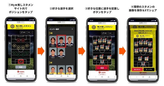 「My★推しスタメン」は、サポーター自身の理想のフォーメーションとメンバーで、柏レイソル/ジェフユナイテッド市原・千葉の“夢のスタメン”を作って遊べる新コンテンツとして提供されました。 サッカーゲームのフォーメーションボードのように、選手配置を直感的に動かしてスタメンを作成でき、完成したスタメン画像はスマートフォンに保存、X(旧Twitter)でシェアできる機能を実装し、SNS上での盛り上がりを創出しました。 ※本施策は2026年2月13日をもって終了いたしました。
