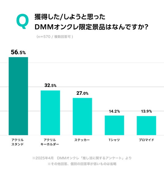 DMMオンクレではアイドルやYouTuber、お笑い芸人などとコラボした、限定グッズを展開しています。ユーザーの4割超がDMMオンクレ限定グッズを獲得する目的でプレイしており、限定グッズの中では「アクリルスタンド」「アクリルキーホルダー」が人気であることがわかりました。