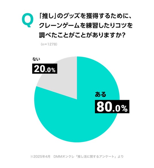 「推しがいる」と回答した人のうち、80%が「クレーンゲームを練習したりコツを調べたことがある」と回答しました。この結果から、オンクレで推し活をするユーザーは熱量が高いという特徴が見られます。
