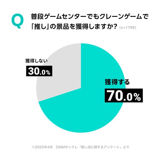 ゲームセンターでもクレーンゲームで「推し」の景品を獲得するという質問に対し、70.8%が「獲得する」と回答しました。