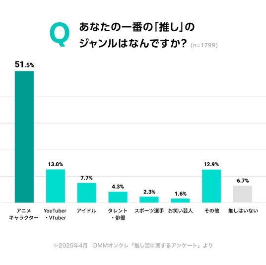 人気の推しジャンルはダントツで「アニメキャラクター」、次いで「YouTuber・VTuber」や「アイドル」が人気