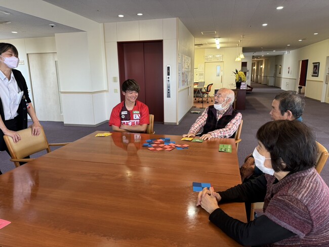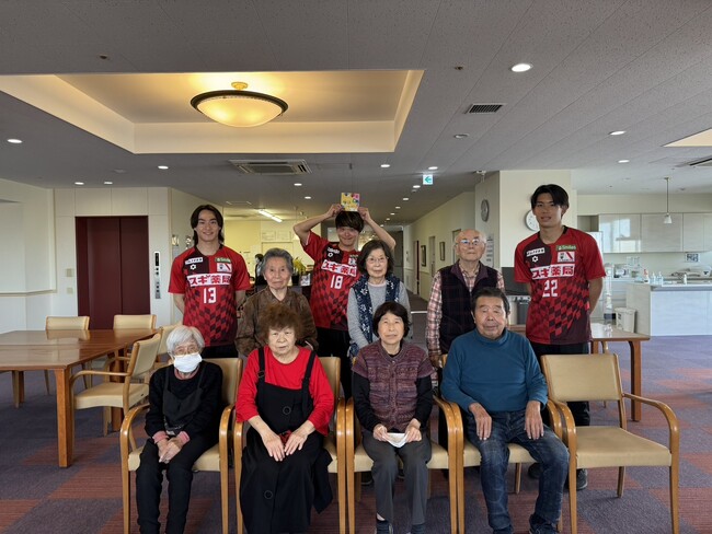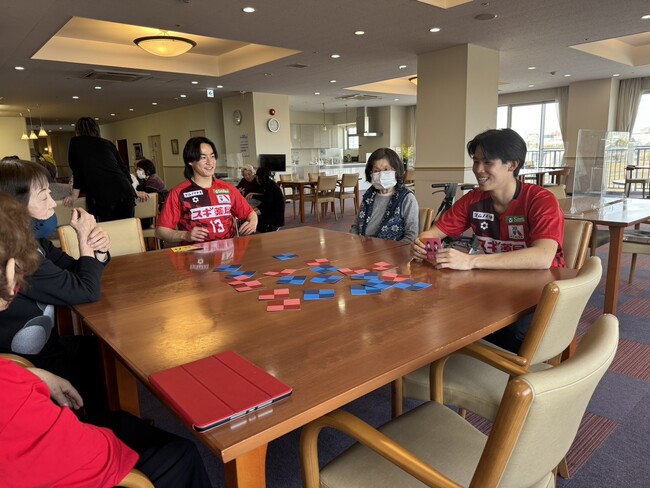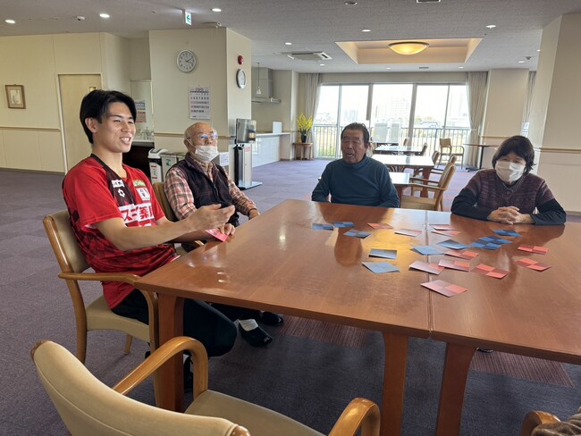 2月20日(月)に馬場琢未選手、向井颯選手、米澤哲哉選手がシャトーヨサミウェルネスに訪問し、利用者様と『懐話ふだ』で交流いたしました。