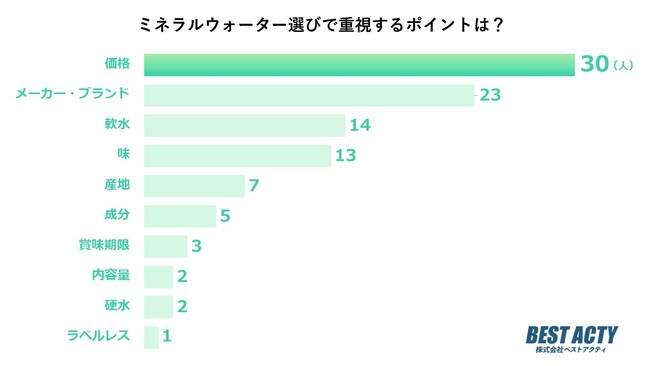 ミネラルウォーター選びで重視するポイントについて100人にアンケートを行ったところ、「価格」と回答する人が最も多い結果となりました。