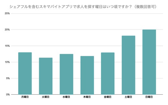 スキマバイトアプリで求人を探す曜日はいつ頃ですか?という質問に対して、平日に比べ土日と回答した方が多く、特に日曜日を選択した方が20%と最も多い結果となった。