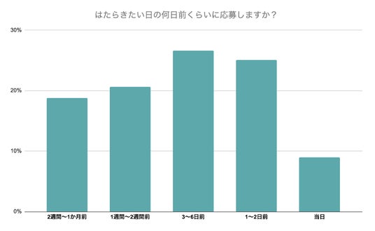 はたらきたい日の何日前くらいに応募しますか?という質問では、3~6日前と回答した方が27%と最も多く、次いで1~2日前と回答した方が25%という結果となった。
