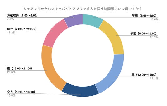 スキマバイトアプリで求人を探す時間帯はいつ頃ですか?という質問に対して、18:00~21:00を選択した方が20.6%と最も多い結果となった。