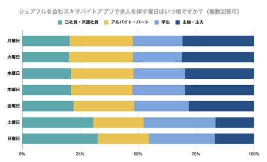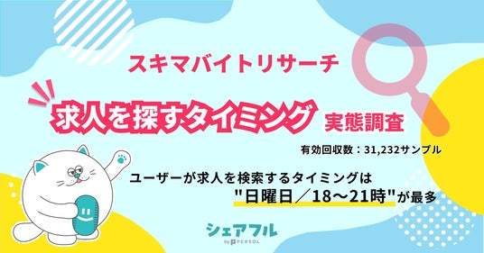 「はたらいて、笑おう。」をビジョンに掲げるパーソルグループのスキマバイトアプリ『シェアフル』やSaaSシフト管理サービス『シェアフルシフト』、就業実績を活用した人材紹介サービス『シェアフルエージェント』などを提供するシェアフル株式会社(本社:東京都港区、代表取締役社長:横井 聡)は、『シェアフル』ユーザーを対象に、求人を探すタイミングに関する実態調査を実施しました。