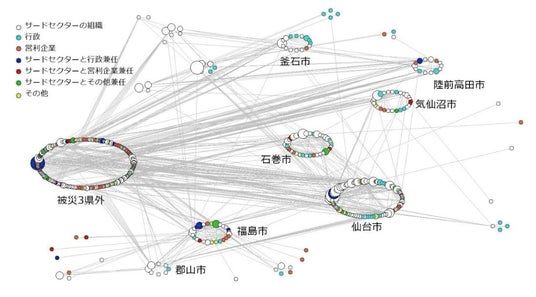 大阪公立大学の菅野拓氏は、社会ネットワークの構造を以下のようなインタビュー調査で調べました。あるサードセクターのキーパーソンに、「東日本大震災でお世話になっていたり、信頼していたりする人を最大10人教えてくれ。行政・営利企業・サードセクターのどこに所属していてもいいし、震災前からのつながりでも、震災後のつながりでもいい。被災地に住んでいる人でも被災地外の人でもいい」と聞いたのです。この質問で把握できた人のうち、震災後に被災地に住んだことがあるサードセクターの人に、さらに同じインタビューをおこないます。これを80人に対して繰り返しました。