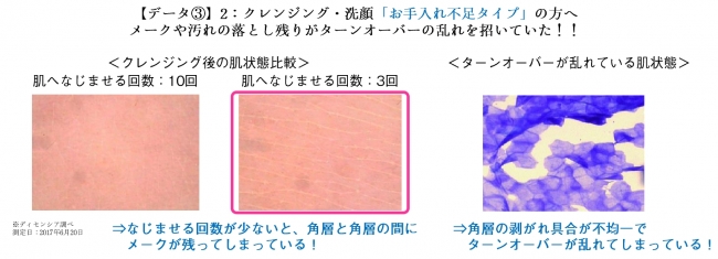 普段から肌が乾燥しており、クレンジング・洗顔の後に乾燥したり肌がつっぱることがないよう、クレンジング・洗顔は肌を強くこすらないように意識している方【データ1.】。その注意が、メークや汚れが落としきれず肌の上にたまってしまうことにつながる可能性があるのです!その結果ターンオーバーが乱れてくすみやゴワつきの発生につながってしまいます!【データ3.】。