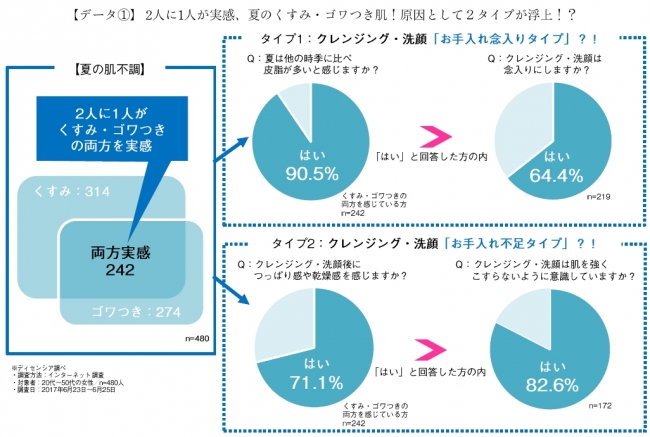 アンケート調査によると、くすみとゴワつきの両方を感じている方が480人中242人と、なんと2人に1人が夏の肌不調を実感していることが分かりました!内訳として、314人が肌のくすみ、274人がゴワつきが気になると回答しています【データ1.】。夏にくすみやゴワつきを感じる理由は…?実は、一つの要因としてクレンジング・洗顔が大きく関わっていたのです!普段のクレンジング・洗顔のお手入れによる上記の肌トラブルは、以下2つのタイプが挙げられます。