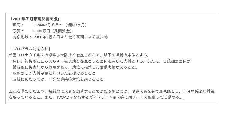 NGO、政府、経済界の連携によって2000年に設置された緊急人道支援組織、ジャパン・プラットフォーム(東京都千代田区/以下、JPF)は、7月3日から続く豪雨による、九州を中心とした各地の甚大な被害の影響を受けた被災者支援のためのプログラムを決定しました。