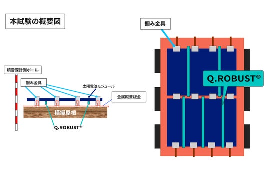 標高580mで豪雪地帯として知られる長野県野沢温泉村中心部を試験場所に選定し、勾配(3寸)で金属縦葺板金の模擬屋根を建設。屋根上にはQセルズ製太陽電池モジュール「Q.PEAK DUO M-G11S」を上下2段設置し、下段の太陽電池モジュールには「Q.ROBUST(R)」を3本、上段の太陽電池モジュールには「Q.ROBUST(R)」を2本取り付け、ダイドーハント製掴み金具8点で固定(下図参照)。試験期間中、計10回の計測を実施し、模擬屋根の真横に立てた積雪深計測ポール2本の平均を図り、積雪深としました。