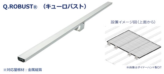 多雪地域向け脱着式補強架台「Q.ROBUST(R)(キューロバスト)」は、「掴み金具工法」を採用し、垂直積雪量200cm以上の多雪地域でも屋根に穴をあけずに太陽光発電システムの設置が可能です。屋根の防水性や耐久性を損なうリスクを最小限に抑えるだけでなく、固定可能範囲内で設置箇所を自在に変更できるため、縦ハゼの位置に影響されません。