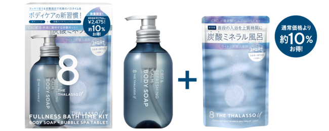 2022年10月にエイトザタラソ ユーに新しくラインアップに加わった「エイトザタラソ ユー CBD*&リフレッシング カーム 美容液ボディソープ」。その発売を記念して、ボディソープ本体(475mL)に炭酸入浴料 ライト(40g×6錠入り)がセットになった、お得なボディケアキットをご用意いたしました。通常より約10%お得な価格で、エイトザタラソ ユーのボディソープが初めての方はもちろん、すでにご愛用いただいている方にもおすすめなキットです。