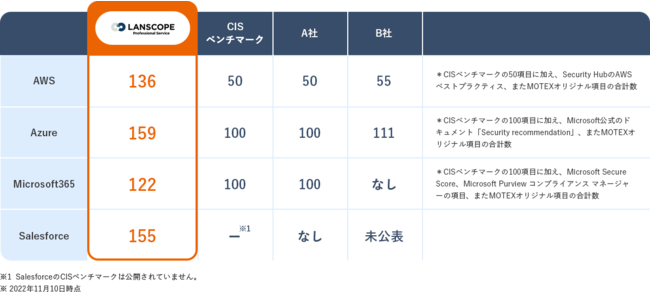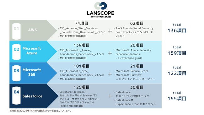 エムオーテックス株式会社(本社:大阪市淀川区、代表取締役社長:宮崎 吉朗、以下MOTEX)は、セキュリティ診断・ソリューション “LANSCOPE プロフェッショナルサービス” が提供する「クラウドセキュリティ診断」において、主要な4つのクラウドサービスであるAmazon Web Services(以下AWS)、Microsoft Azure、Microsoft 365、Salesforceに対するセキュリティ診断項目を大幅に拡充したことを発表します。