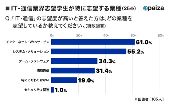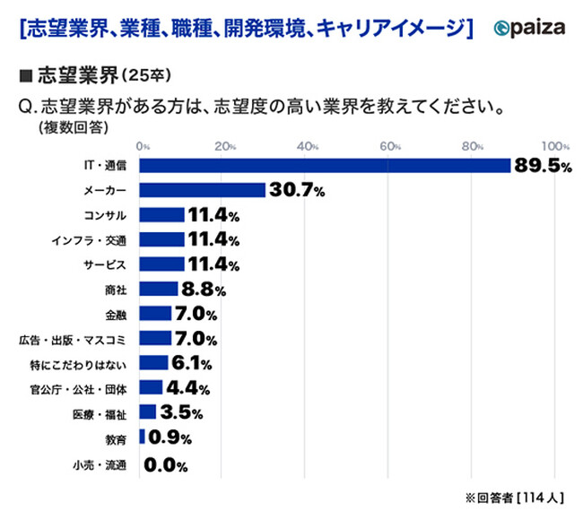 ITエンジニア職専門の就職情報サービス「paiza新卒」に登録している学生の志望業界は、例年通りインターネット・Webサービスを提供する企業やシステム・ソリューションを提供する企業(SIer)が属する「IT・通信」が圧倒的に高くなっている