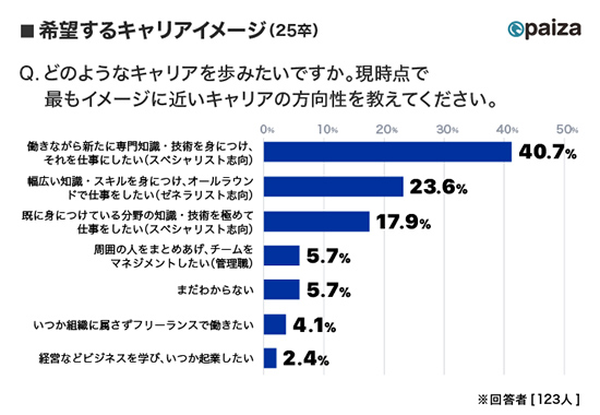 多くの学生が特定領域で自身の専門性や技術を追求するスペシャリスト(40.7%)になることを希望しており、マネジメントやビジネス全般にスキルの幅を広げていくゼネラリスト(23.6%)を大きく離している。
