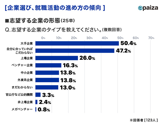 ・企業選び、就職活動の進め方:大手企業にこだわらず、自分に合いそうな企業を数多く受けて比較検討したいと考える学生が増加。ジョブ型採用の影響が伺える