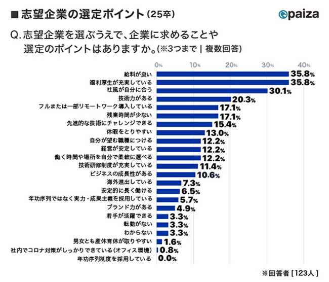 今回の調査結果でトップとなったのは「給料が良い」でこの傾向は例年通り。新型コロナウイルスの影響からIT企業では多くの会社がリモートワークを取り入れており、リモートワークの重視度も17.1%と比較的高い。一方で就職経験がない学生は直接人と会うことで人間関係を構築したり、業務を教えてもらえる環境を求めているという声も聞かれる。