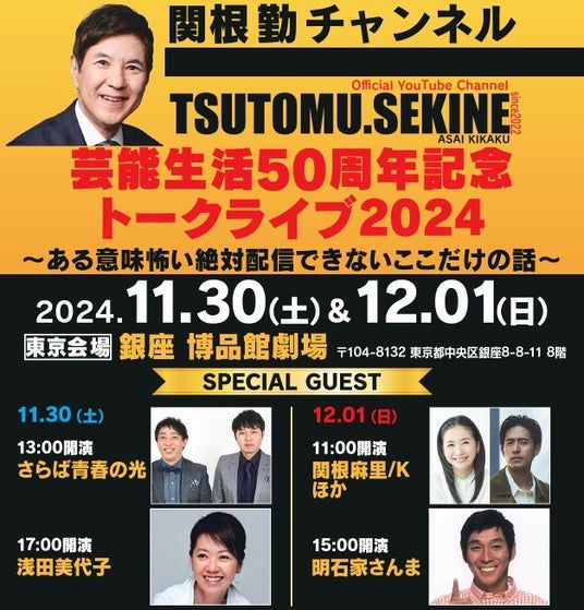 「関根勤チャンネル 芸能生活50周年記念トークライブ2024~ある意味怖い絶対配信できないここだけの話~」公演が、大阪・東京で開催が決定いたしました!